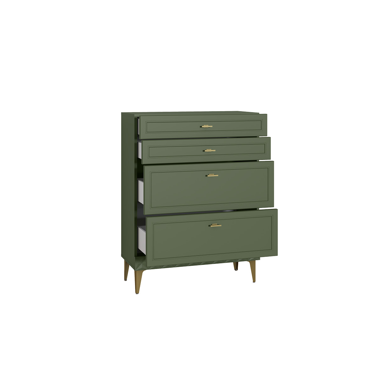 Изящные линии, глубокая фрезеровка фасадов из МДФ и благородные оттенки. Утончённая «Слоновая кость» и изысканная «Олива Шагрень» с глубоким зелёным тоном — создают атмосферу уюта, тепла и благородства. Металлические ручки и опоры золотого цвета придают мебели утончённый блеск, а петли и направляющие с доводчиками обеспечивают плавное и бесшумное закрытие фасадов.