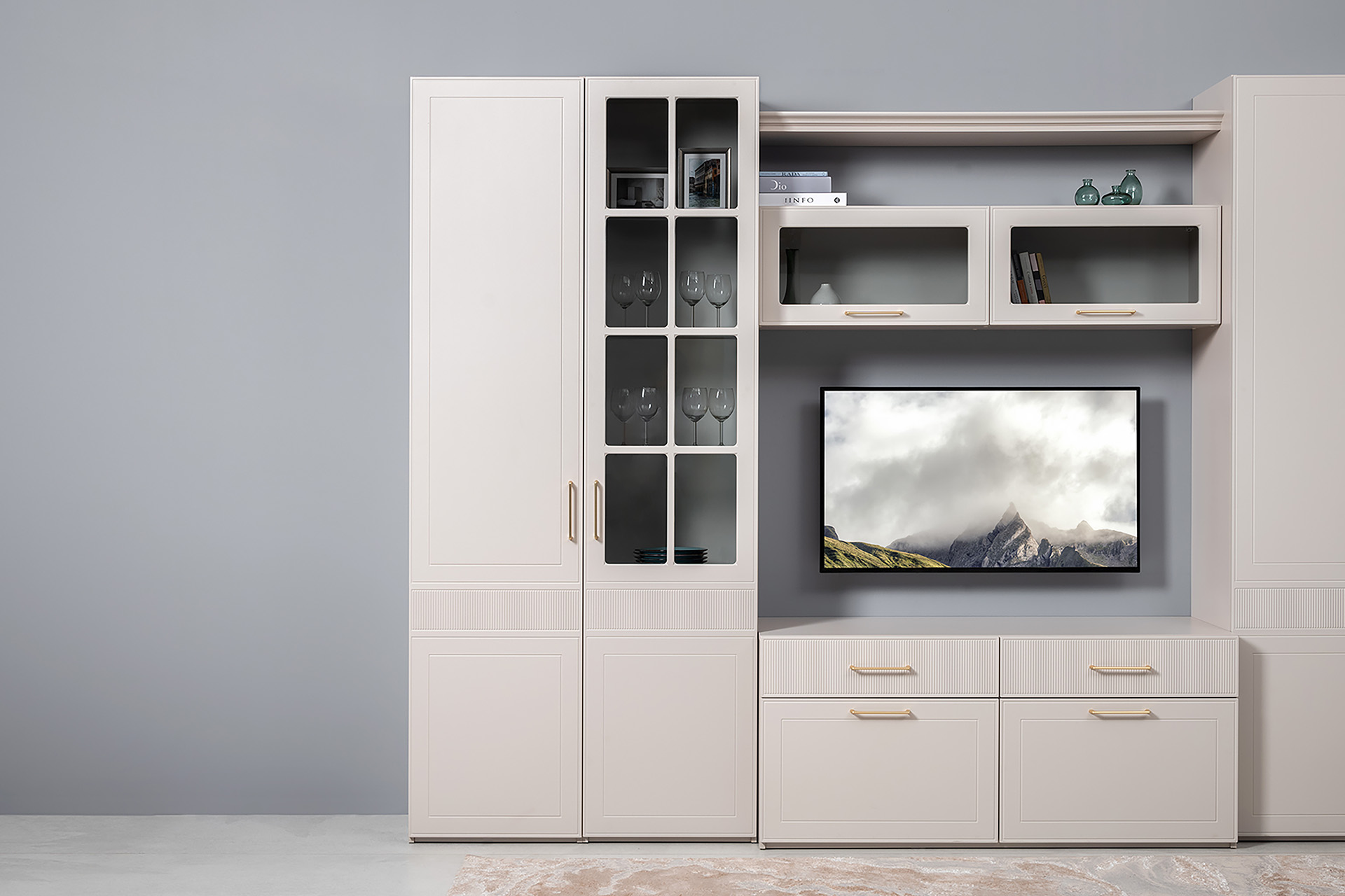 Тумба под ТВ Ричфорд 16.61 кашемир 5981 BS, моно керамика D166-2 ПВХ, белый PE шагрень