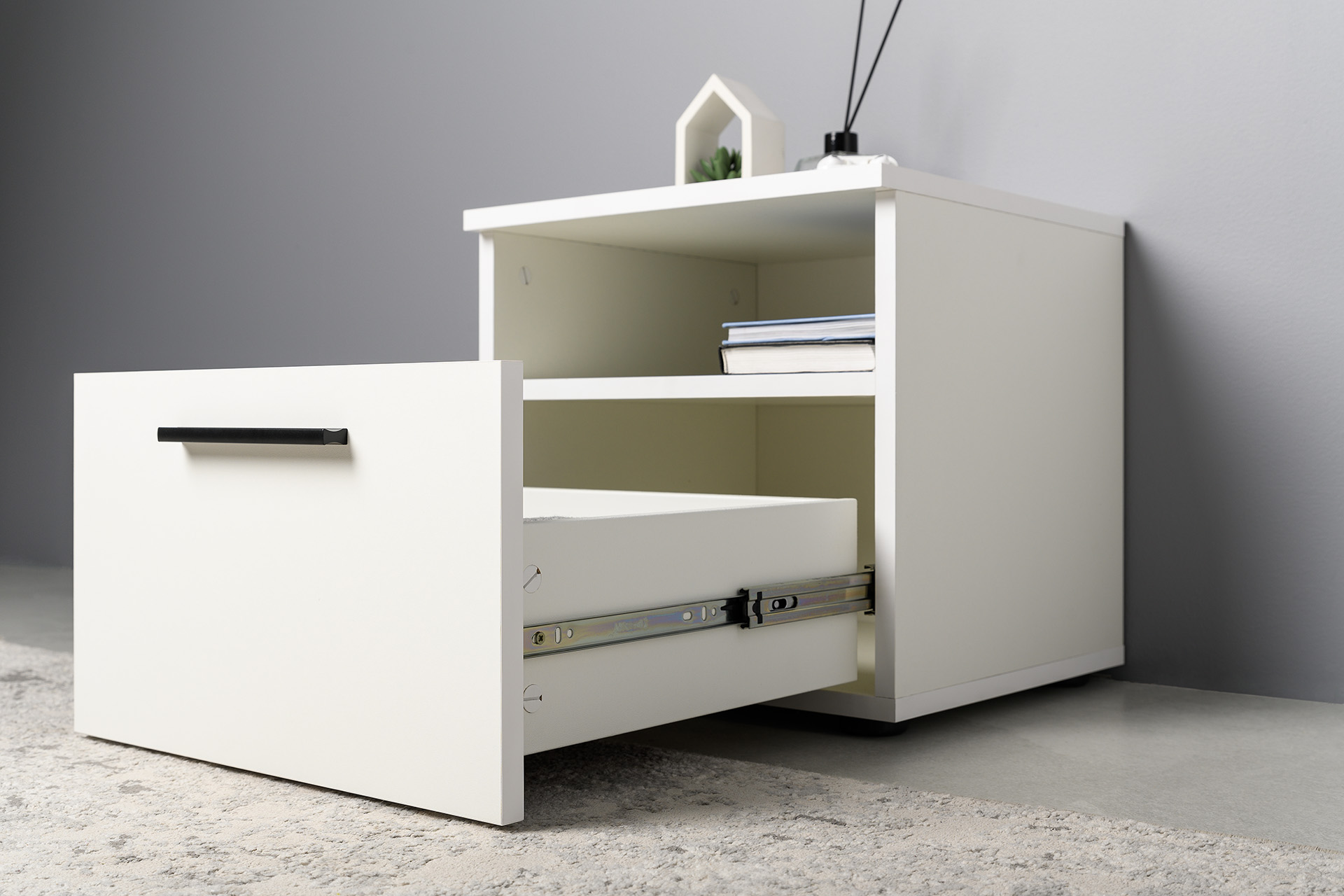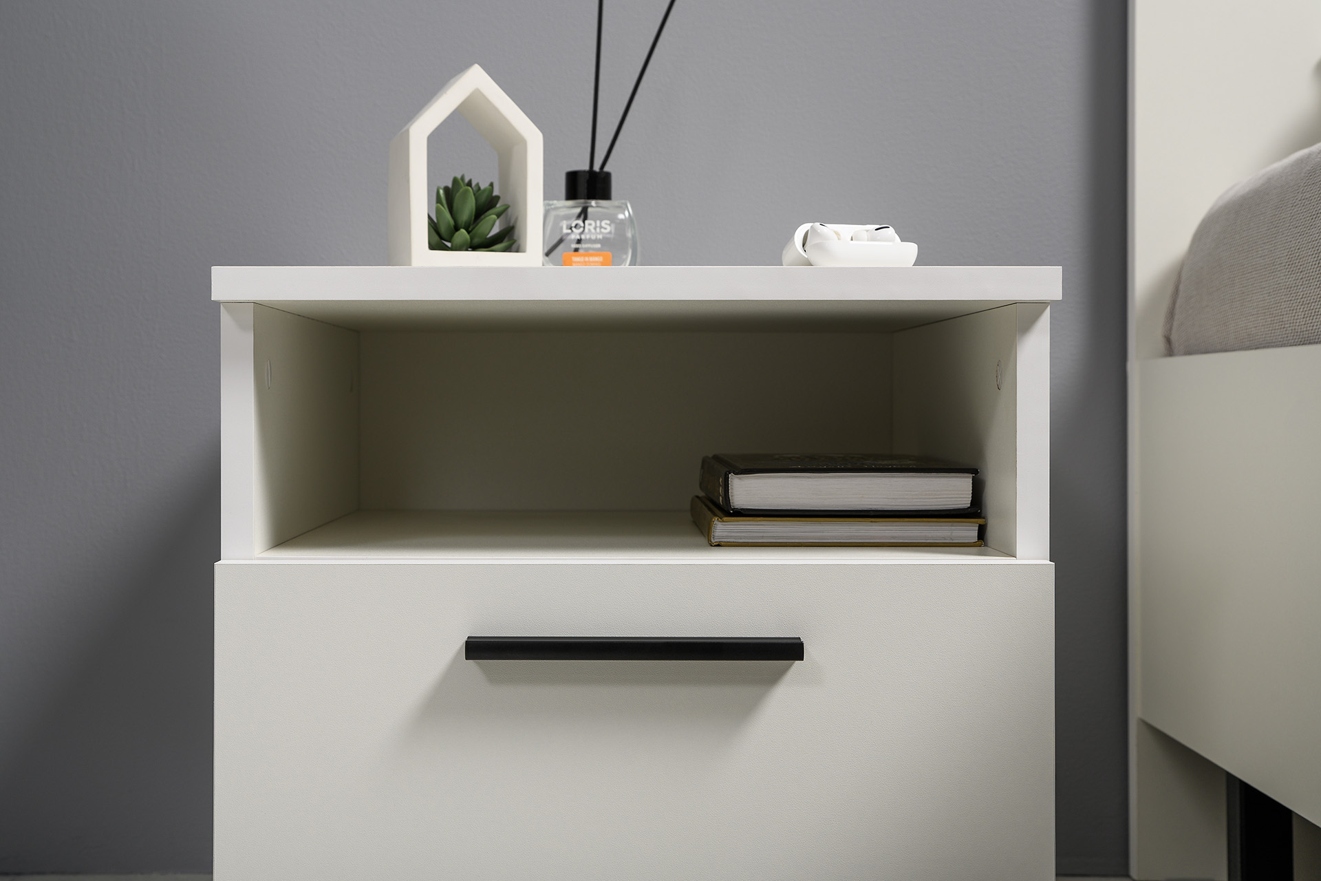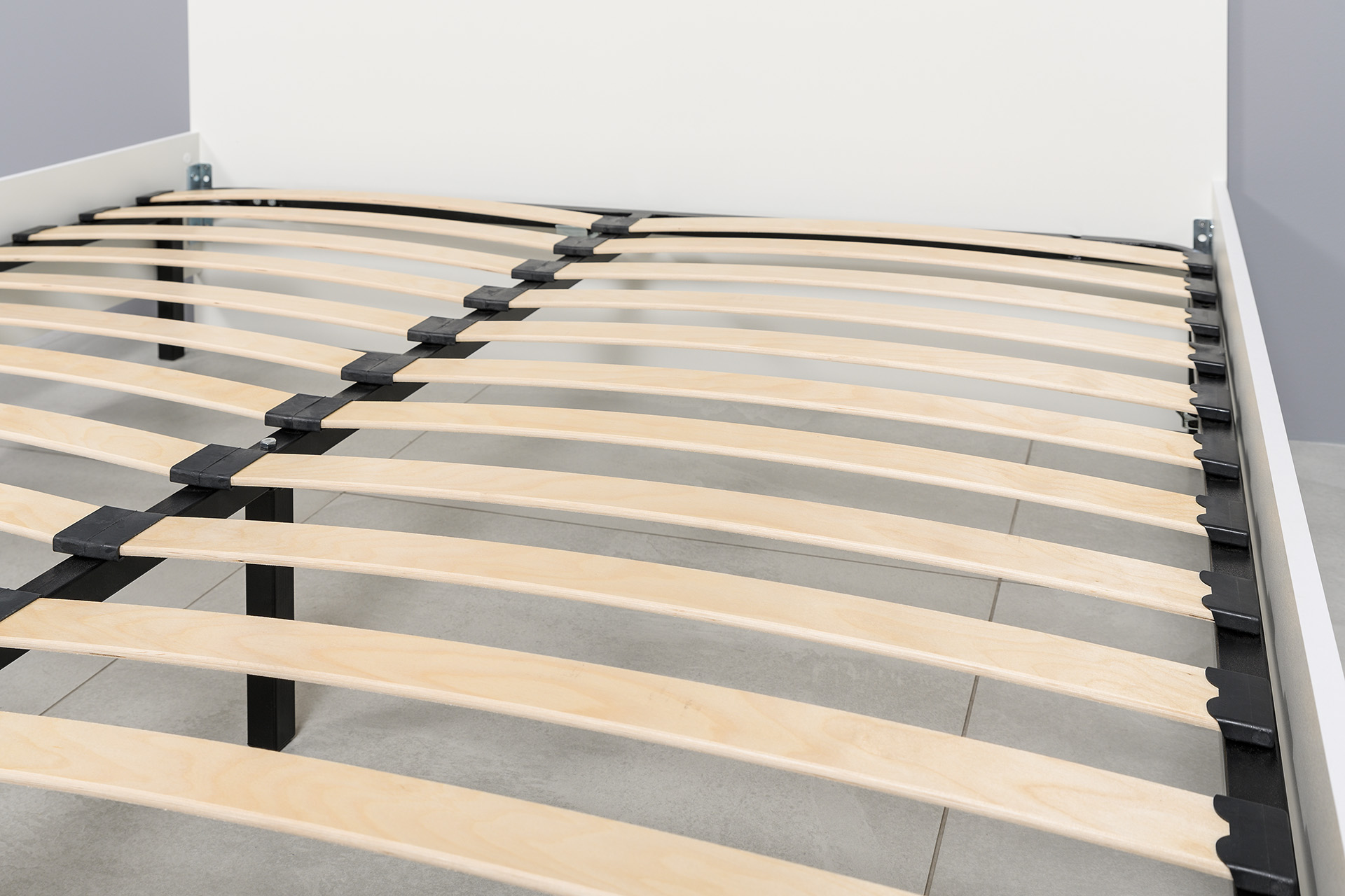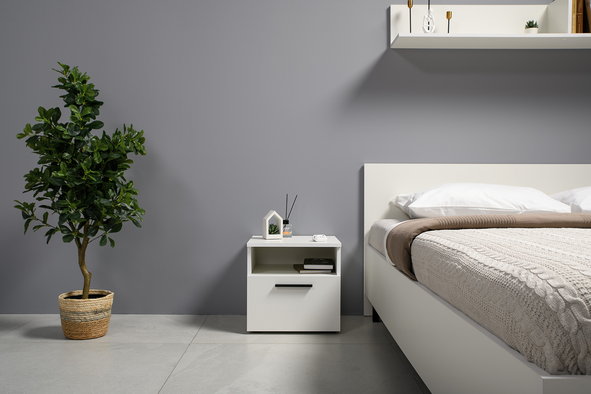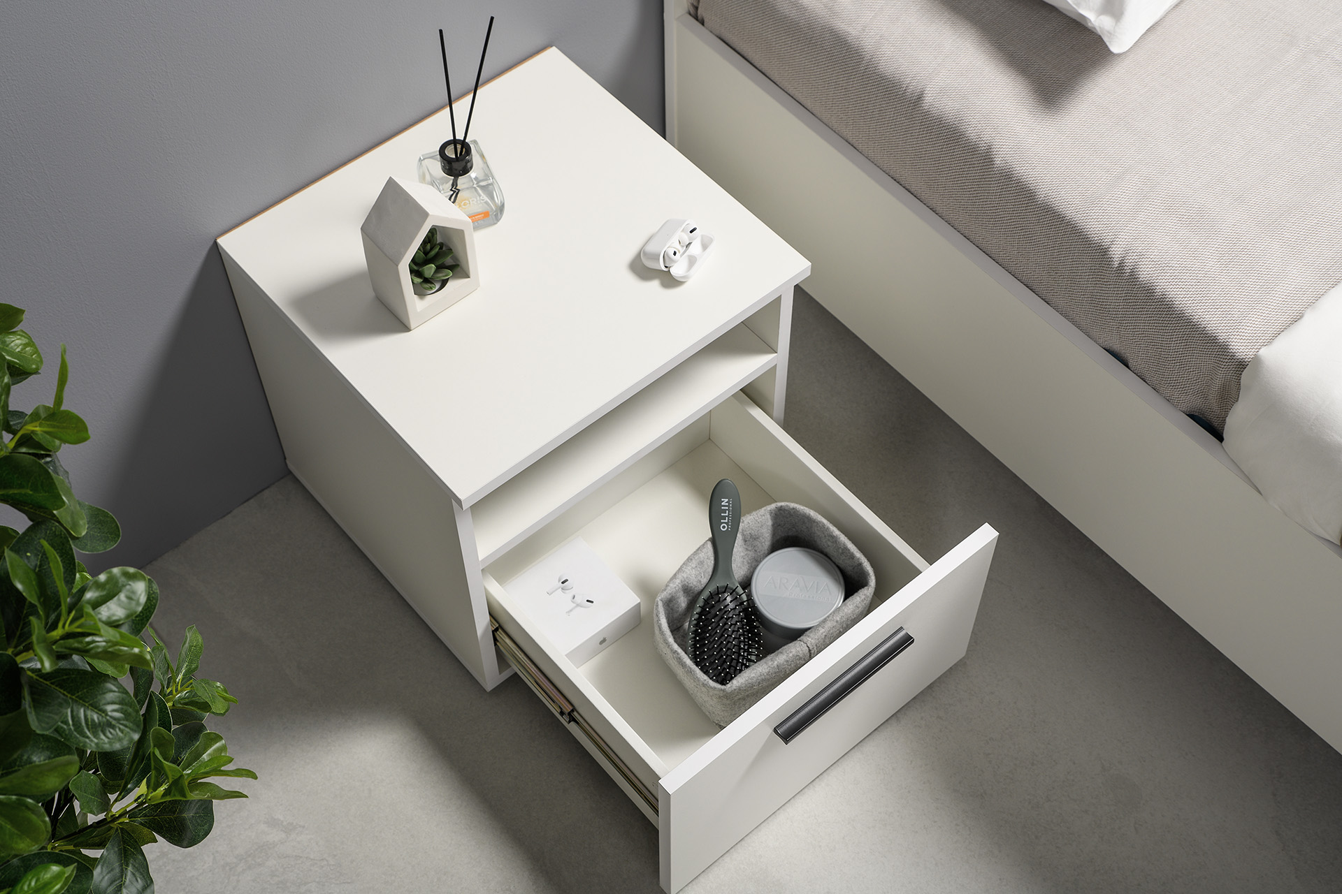 Два варианта кровати: ширина спального места 1200 и 1600 мм. Вместительный трёхстворчатый шкаф полноценной глубины с выдвижными ящиками и съемными полками. Ящики оснащены направляющими полного выдвижения.